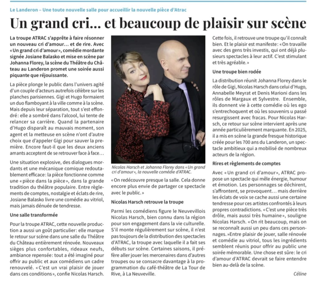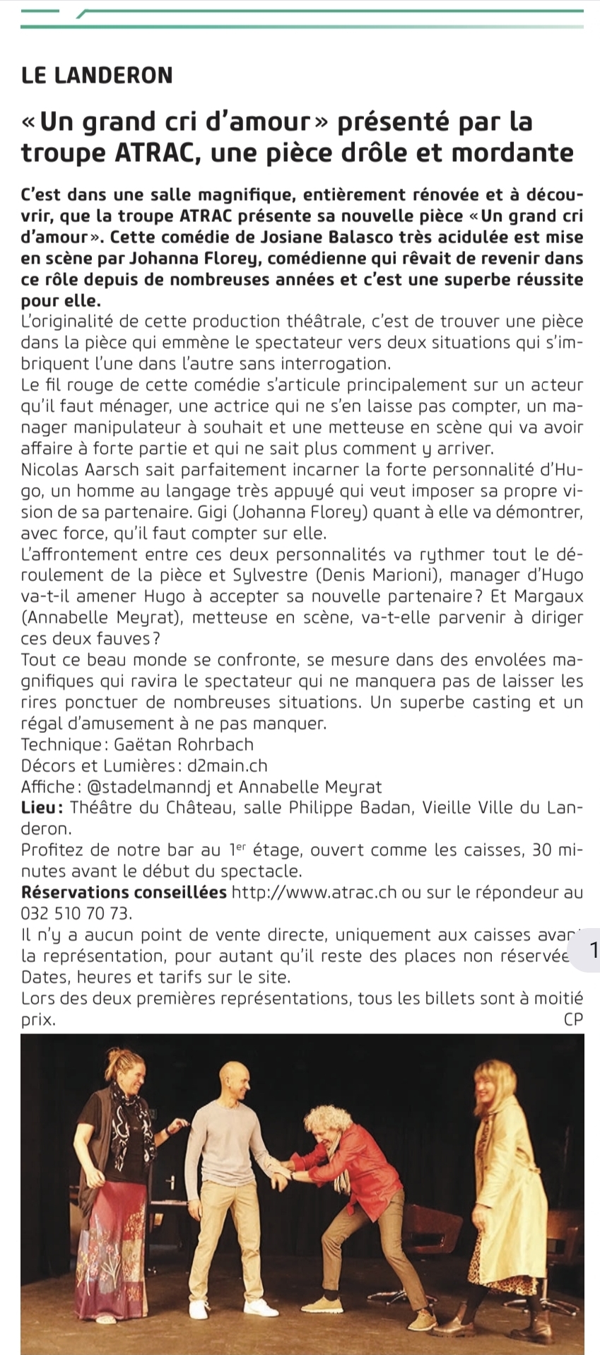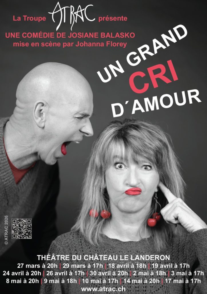 La Troupe ATRAC vous donne rendez-vous du 27 mars au 17 mai 2026 pour “UN GRAND CRI D’AMOUR” une comédie de Josiane Balasko, mise en scène par Johanna Florey, dans une salle rénovée !
